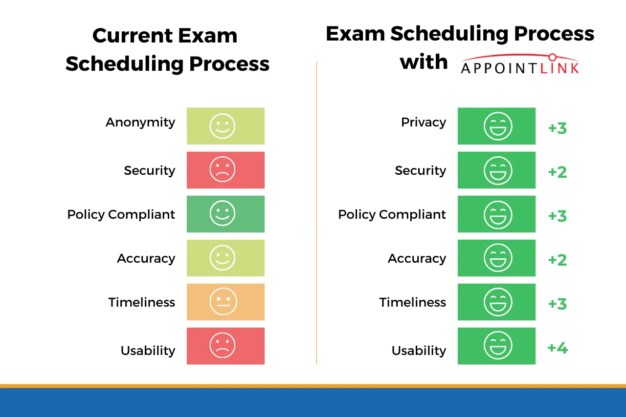 Security (+2): Exam schedules and accommodation data often travel across spreadsheets, inboxes, and systems. Every manual transfer introduces vulnerability. AppointLink secures this process end-to-end, eliminating the need to move files or share private information over email.